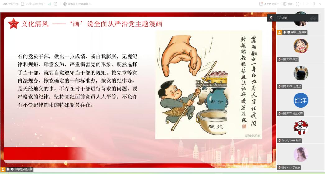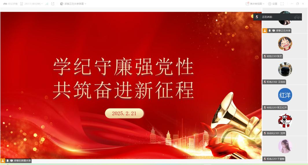 活动以“第一议题”形式学习了习近平总书记在二十届中央纪律检查委员会第四次全体会议上的重要讲话,并结合典型案例进行了深入的解读,引导全体党员深刻认识到违纪违法的严重危害,严明政治纪律和政治规矩。随后,党员同志们围绕党纪法规开展知识竞赛活动,竞赛分为按顺序作答与抢答两个环节,并在竞赛中穿插相关的知识点,参赛者可以更直接地了解和吸收廉洁知识,从而增强自身的廉洁自律意识。竞赛结束后,支部组织全体成员观看了警示教育片。影片展现了新时代反腐败斗争的实践,以“片中人”警醒“看片人”,引入深思,具有深刻的警示教育意义。活动最后,韩丽娟老师总结发言,她呼吁青年党员要严守纪律底线,保持廉洁自律,履行好党员的职责和使命。将活动中的所学、所思、所悟转化为实际行动,以更加坚定的信念和更加饱满的热情投入到学习和工作中。