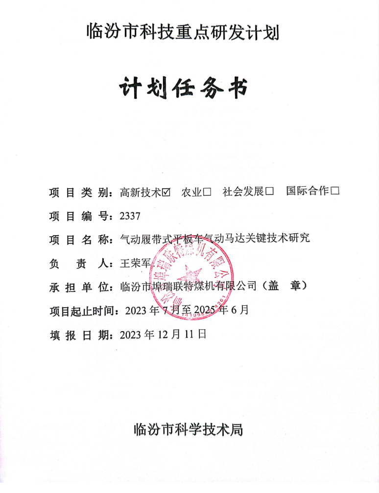 由公司闫献国教授、王荣军教授主持承担、与临汾市埠瑞联特煤机有限公司合报的临汾市科技重点研发计划项目获批。该项目针对气动履带式平板车气动马达轴承磨损快,润滑不够,轴承烧坏等现象,从影响气动马达关键零部件使用寿命的影响因素入手,完成基于非均匀气流场作用的气动马达关键零部件受力解析技术;高转速环境下多因素交互影响的气动马达关键零部件温度场分布、基于多场耦合作用的气动马达结构优化设计的相关内容。项目创新点体现在非均匀气流场作用的零部件间相互作用机制;多因素交互影响温度场模型;耦合非均匀气流场作用和多因素交互影响的温度场分布的设计方法,采取“理论分析-数值模拟-实验验证”三位一体的研究方法,开发转速高(4000-6000r/min)、结构紧凑、输出功率高(7kW)的矿用气动履带式平板车气动马达,完成气动履带式平板车气动马达关键技术研究。